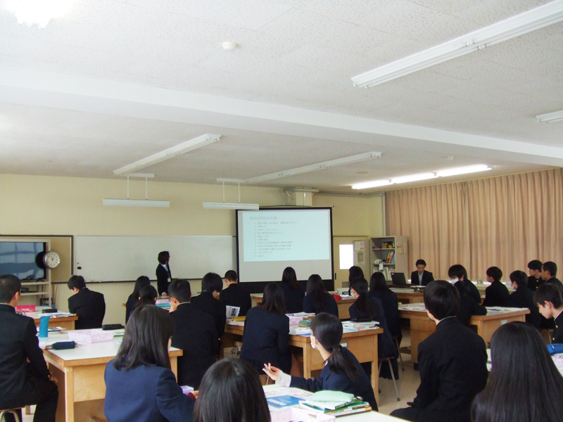 55分間の授業の中で主に高齢者の介護について講義を行い、生徒の皆さんと共に今の自分に何が出来るか考え、意見を発表してもらいました。