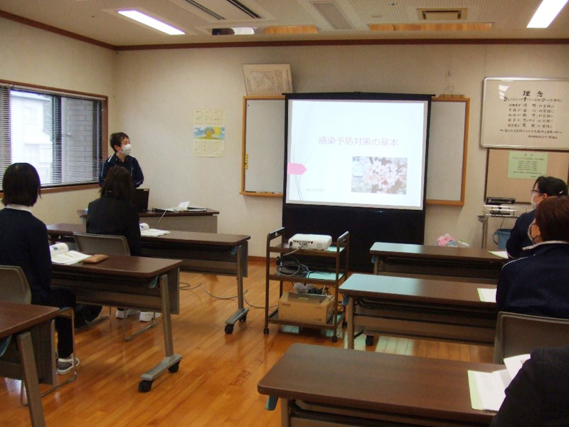 法人の理念についての説明や感染症予防・腰痛予防などについて専門の職員から実技を交えた講義がありました。