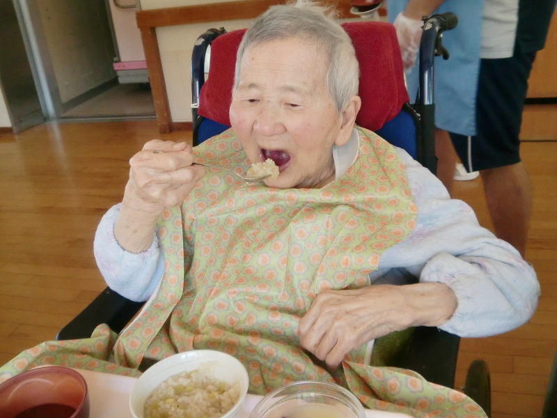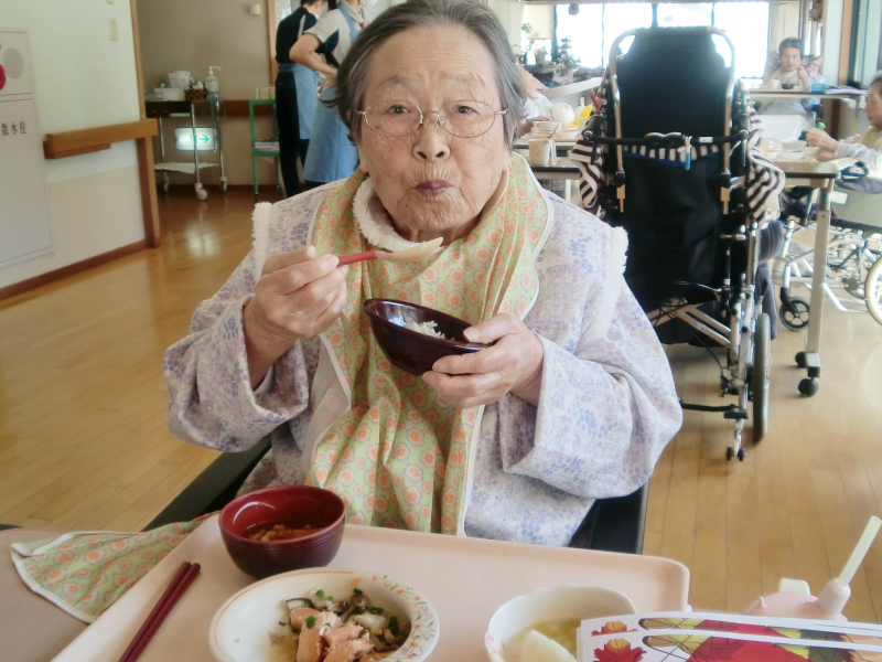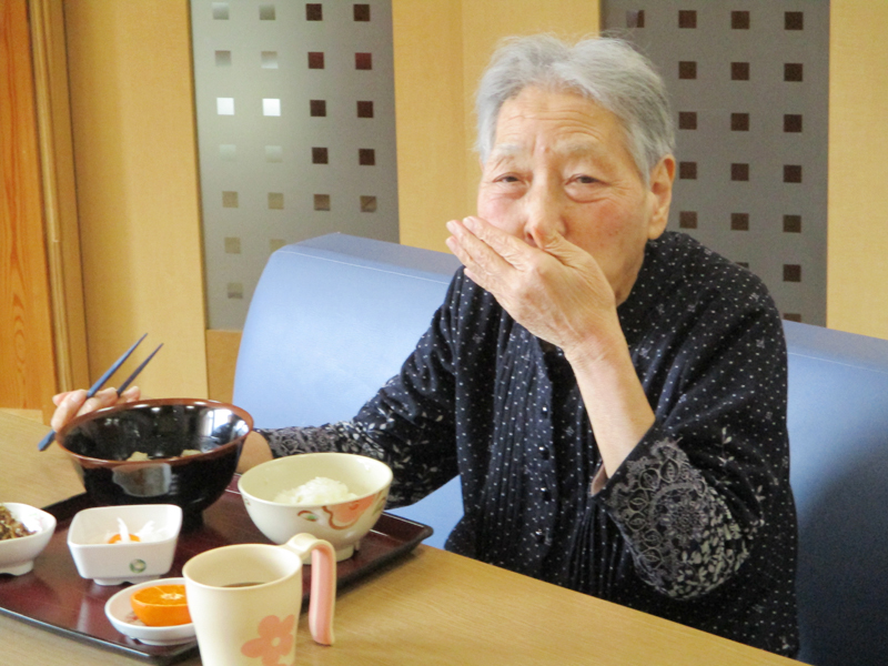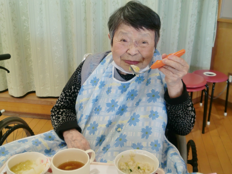 食事が始まった頃に食事中の様子を見に行きメニューや食材について話したり、食事の感想やメニューに取り入れてほしいものは何かと聞いたりと、ご利用者の声を大切にしています。