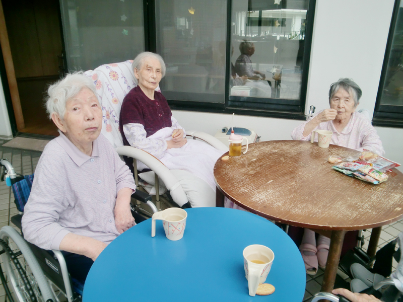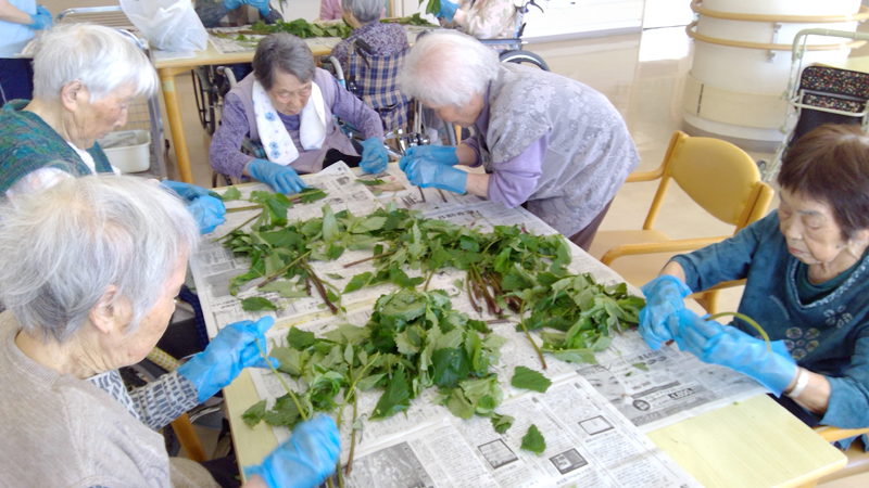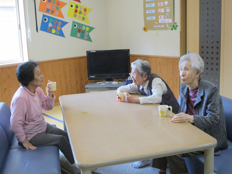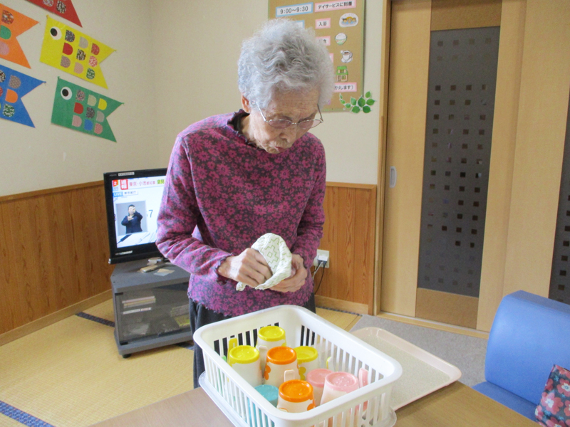 14:00~ 活動、お茶の時間 洗濯物たたみやコップ拭きのお手伝いをして下さったり、歌を歌ったり作品作りをしたりしています。活動が一段落した後は飲み物を提供し話をして過ごされています。
