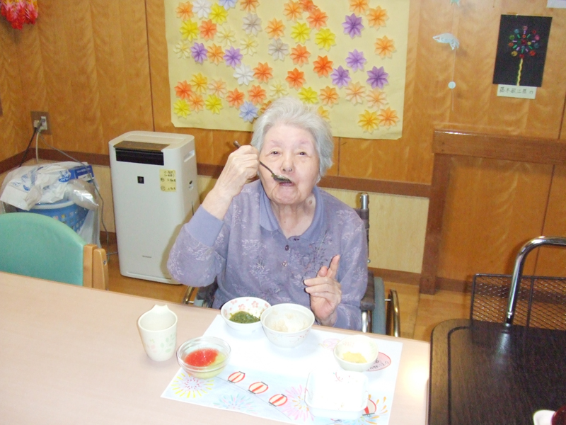 12:00~ 昼食 いよいよ楽しみのお昼ご飯です。利用者の皆さんからいつもおいしいと好評です。