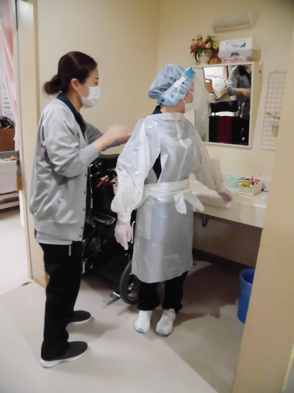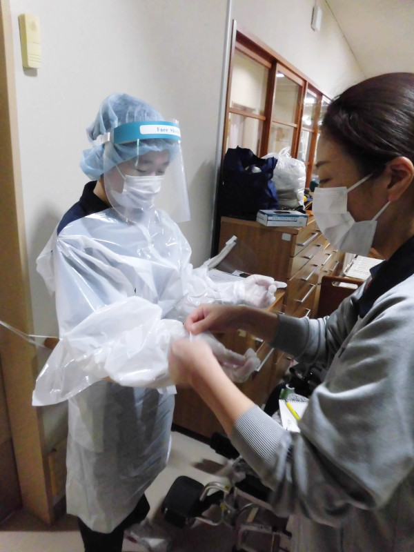 ガウンの適切な使用方法を、実技を通して学習しました。ボランティアで作っていただいたガウンは、職員一人ひとりが正しい手順で適切に着脱し、感染を広めないように心がけて使用します。