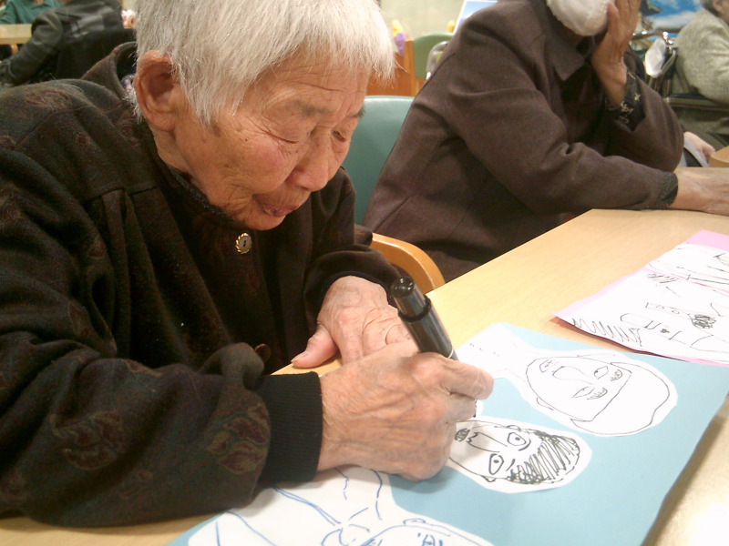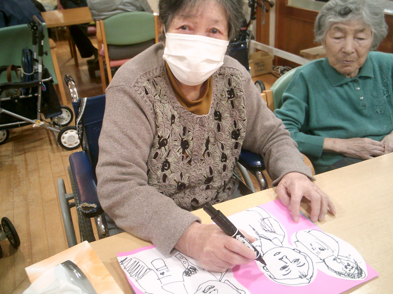 ご利用者8人グループで協力して、職員の目・鼻・口・輪郭など、パーツを一人ひとつ書いて、顔を完成させるレクリエーションです。みなさんそれぞれ顔の特徴を感じ取って書いており、完成度の高い絵もありました。